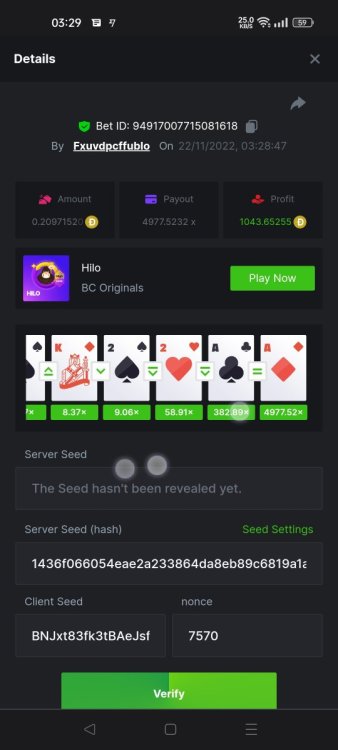 1. Hi fellow Hi-Lo's. Got lucky with 4 A & K .... And! I hit an almost 5000x Please see betlink to view/verify. https://bc.game/#/sd/10XNMKKTI9XXQR Hi everyone I got lucky with Kings and Aces Also had a great win with my almost 5000x multiplyer: here is the betlink https://bc.game/#/sd/10XNMKKTI9XXQR